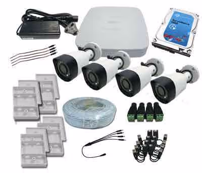 4 Channel DVR CCTV kit, Dahua 4 channel 1080N/720P XVR, 1 x 1TB hard drive, 4 x Dahua 2 MP dome cameras, 1 x power supply, 1 x 100m cat 5 cable, 4 x video baluns, 4 x DC plugs, 4 x round junction enclosure