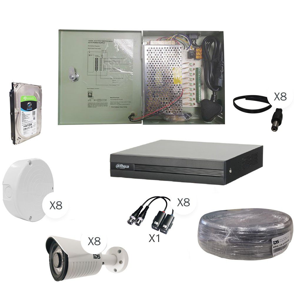 8 Channel DVR CCTV kit, Dahua 8 channel 1080N/720P XVR, 1 x 1TB hard drive, 4 x Dahua 2 MP dome cameras, 1 x power supply, 1 x 100m cat 5 cable, 4 x video baluns, 4 x DC plugs, 4 x round junction enclosure